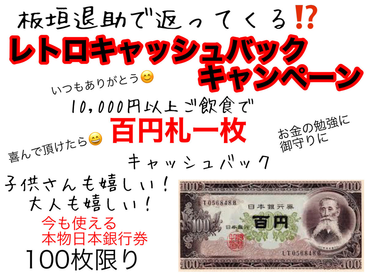 板垣退助、百円札、キャッシュバックプレゼントキャンペーン🎁